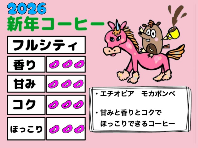 新年のお豆のお知らせです 2026年のコーヒーは 『エチオピア モカボンベ』さん 深煎りで焼いても フルーティーな香り コク 甘い余韻が続きます 一年のはじまりに ポワっと癒されながら 今年の目標を立てたり 日々の疲れを吹っ飛ばしてみてください