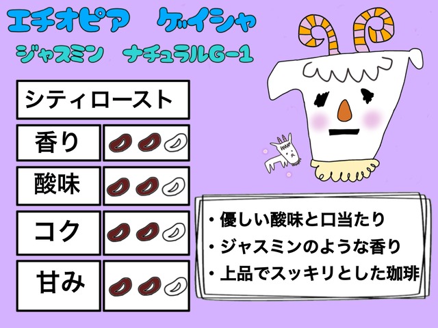 優しい酸味と口当たり ジャスミンのような香り 上品で華やかさもあり スッキリとしたコーヒーです
